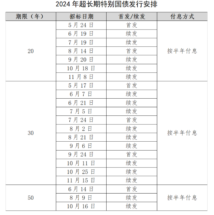 5月13日,財(cái)政部發(fā)布《2024年一般國債、超長期特別國債發(fā)行有關(guān)安排》,其中超長期特別國債涉及期限為20年、30年、50年。