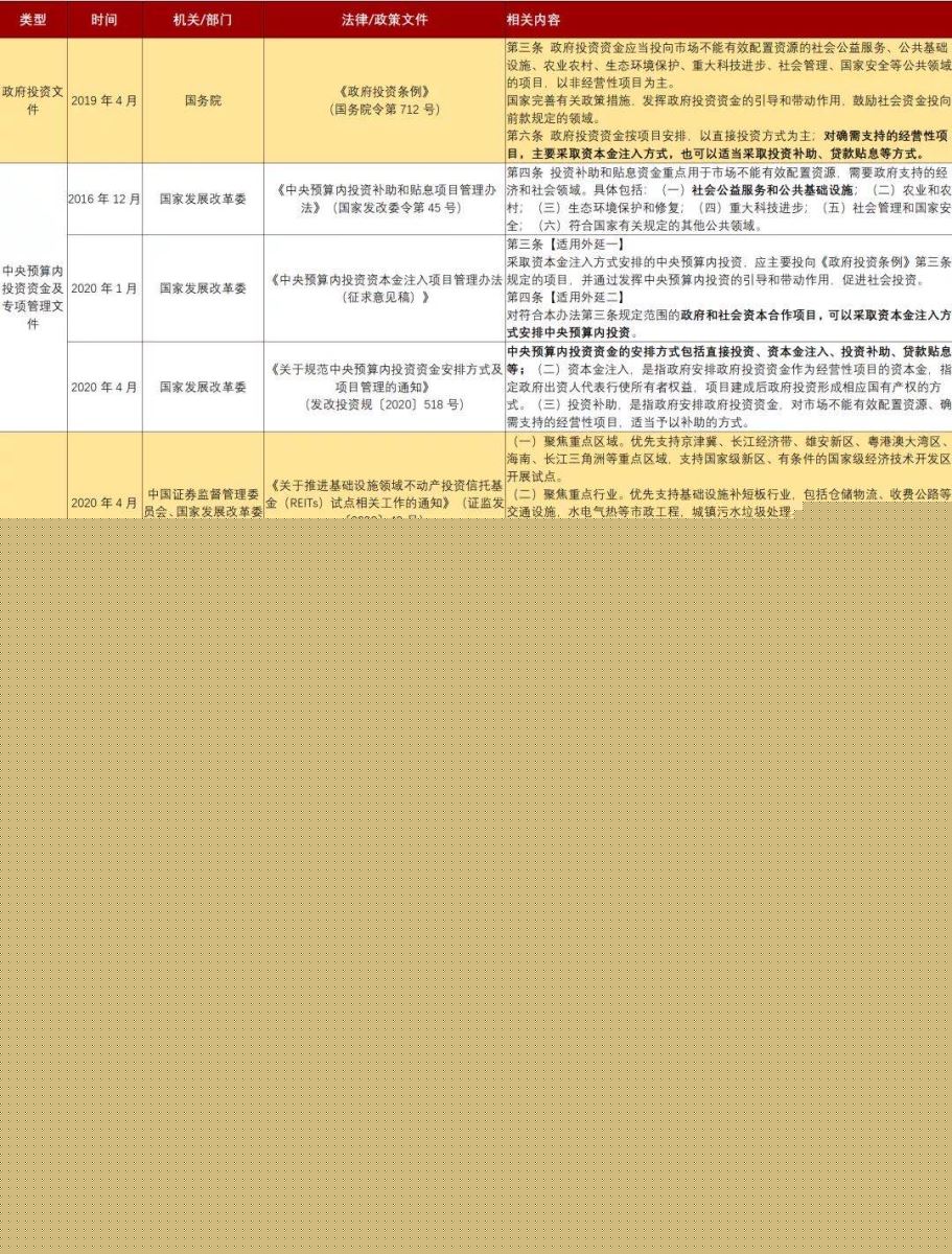 《辦法》中明確支持采用不動產(chǎn)投資信托基金(REITs)、政府和社會資本合作(PPP)的方式盤活國有存量資產(chǎn),由此?????,從支持的領(lǐng)域和區(qū)域來看,公募REITs(指基礎(chǔ)設(shè)施領(lǐng)域不動產(chǎn)投資信托基金,下同)、政府和社會資本合作(PPP)模式聚焦支持的區(qū)域及行業(yè)完全符合《辦法》中“支持范圍”的重點領(lǐng)域、重點區(qū)域?????♂?、重點項目要求。本文針對政府投資、中央預(yù)算內(nèi)投資管理、公募REITs、政府和社會資本合作(PPP)盤活存量的相關(guān)文件進行了梳理(如下表),并進一步明晰。