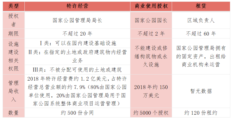 美國國會于1998年更新了《特許權(quán)管理改進法案》(1998年)及實施條例????,美國國家公園由國家公園管理局(NPS, National Park Service)統(tǒng)一管理?????!斗ò浮穼夜珗@的各類項目實施特許經(jīng)營分類管理??,項目被分為特許經(jīng)營、小型商業(yè)利用授權(quán)?、租賃三種形式。