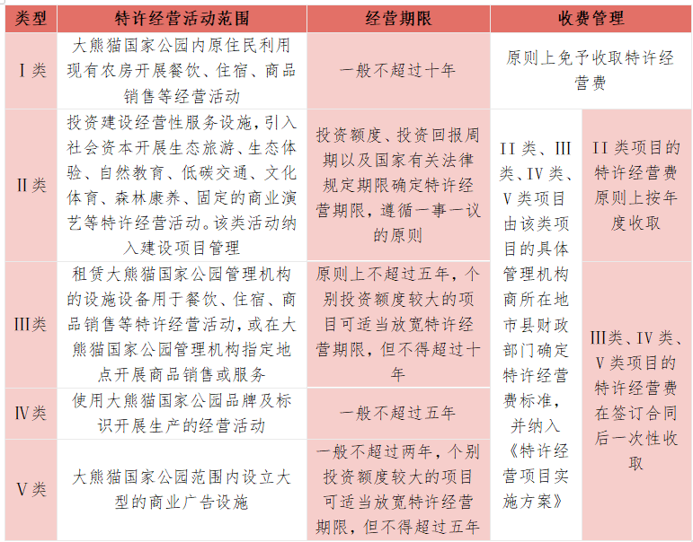 《管理辦法》明確社會資本可通過特許經(jīng)營方式參與國家公園的餐飲??、住宿、生態(tài)旅游、低碳交通、文化體育、森林康養(yǎng)????、商品銷售等及其他服務(wù)領(lǐng)域??????????,使用大熊貓國家公園品牌及標識開展生產(chǎn)經(jīng)營活動也屬于特許經(jīng)營管理范疇。《管理辦法》對上述授權(quán)范圍做了分類,共分為以下五類?????♀?。