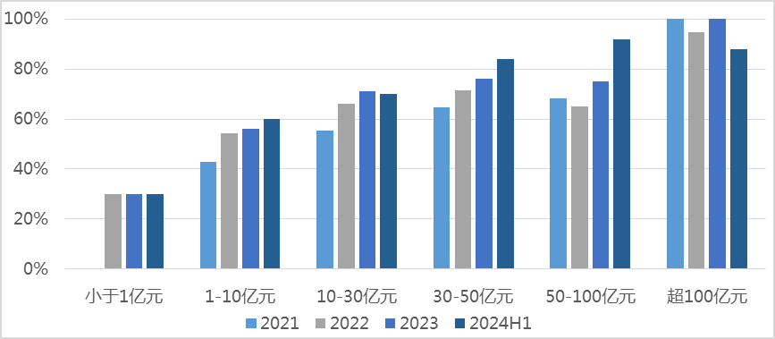 根據(jù)清科研究??,2023年至2024年上半年新成立的基金中,國(guó)有基金管理人在認(rèn)繳規(guī)模不到1億元的小型基金中占比約30%,在認(rèn)繳規(guī)模1億元~30億元的中型基金中約占比約60%~70%,而在認(rèn)繳規(guī)模30億元以上的大型基金中約占比約85%~100%。