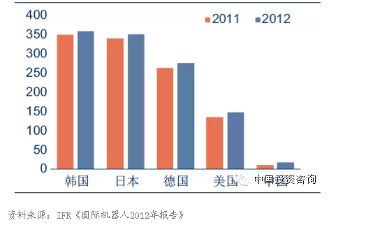 此外我國目前工業(yè)機器人使用密度也遠低于世界平均水平。2011年,中國機器人密度(每萬名工人機器人保有量)約為28臺/萬人,僅為世界平均水平55 的一半。相比于自動化發(fā)達的國家如韓國(357臺)?????♂?、日本(349臺)???????????????♀?、德國(274臺),中國機器人行業(yè)潛力巨大,目前尚有10倍以上的成長空間。