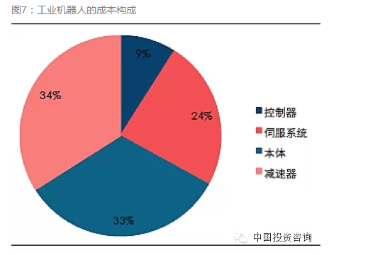 成本方面,工業(yè)機器人本體的機械結(jié)構(gòu)占比30%左右???????,約60%的成本來自伺服系統(tǒng)和減速器等關鍵零部件????,減速機、伺服電機及控制器分別占比約30%?????♀?、25%和10%??。