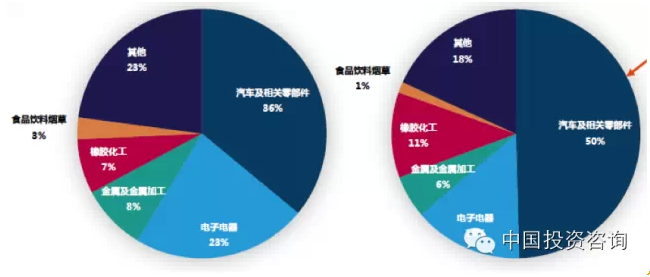 從工業(yè)機器人終端需求來看?????♂?,汽車及零部件、電子、金屬及化工等4大行業(yè)應用是國外工業(yè)機器人的主要需求????,共計占比達74%?;中國工業(yè)機器人下游應用行業(yè)更加集中????,汽車及相關零部件占比達總應用的一半,而橡膠??、金屬、電子等行業(yè)占比相對平均,在6%-14%之間。