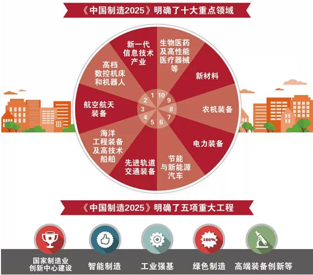 《中國(guó)制造2025》提出了“創(chuàng)新驅(qū)動(dòng)?????、質(zhì)量為先、綠色發(fā)展、結(jié)構(gòu)優(yōu)化??、人才為本”的基本方針,制定了三步走的戰(zhàn)略目標(biāo),明確了9項(xiàng)戰(zhàn)略任務(wù)和十大重點(diǎn)領(lǐng)域。這一行動(dòng)綱領(lǐng)的編制是我國(guó)第一次從國(guó)家戰(zhàn)略層面描繪了建設(shè)制造強(qiáng)國(guó)的宏偉藍(lán)圖,是我國(guó)為制造業(yè)發(fā)展進(jìn)行的一次頂層設(shè)計(jì)??,是我國(guó)向制造強(qiáng)國(guó)轉(zhuǎn)變的重要推動(dòng)力。