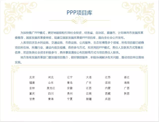 去年12月?,發(fā)改委印發(fā)《關于開展政府和社會資本合作的指導意見》?????♀?,要求各?。ㄗ灾螀^(qū)???、直轄市)發(fā)改委要建立PPP項目庫,及時跟蹤調(diào)度??、梳理匯總項目實施進展?。